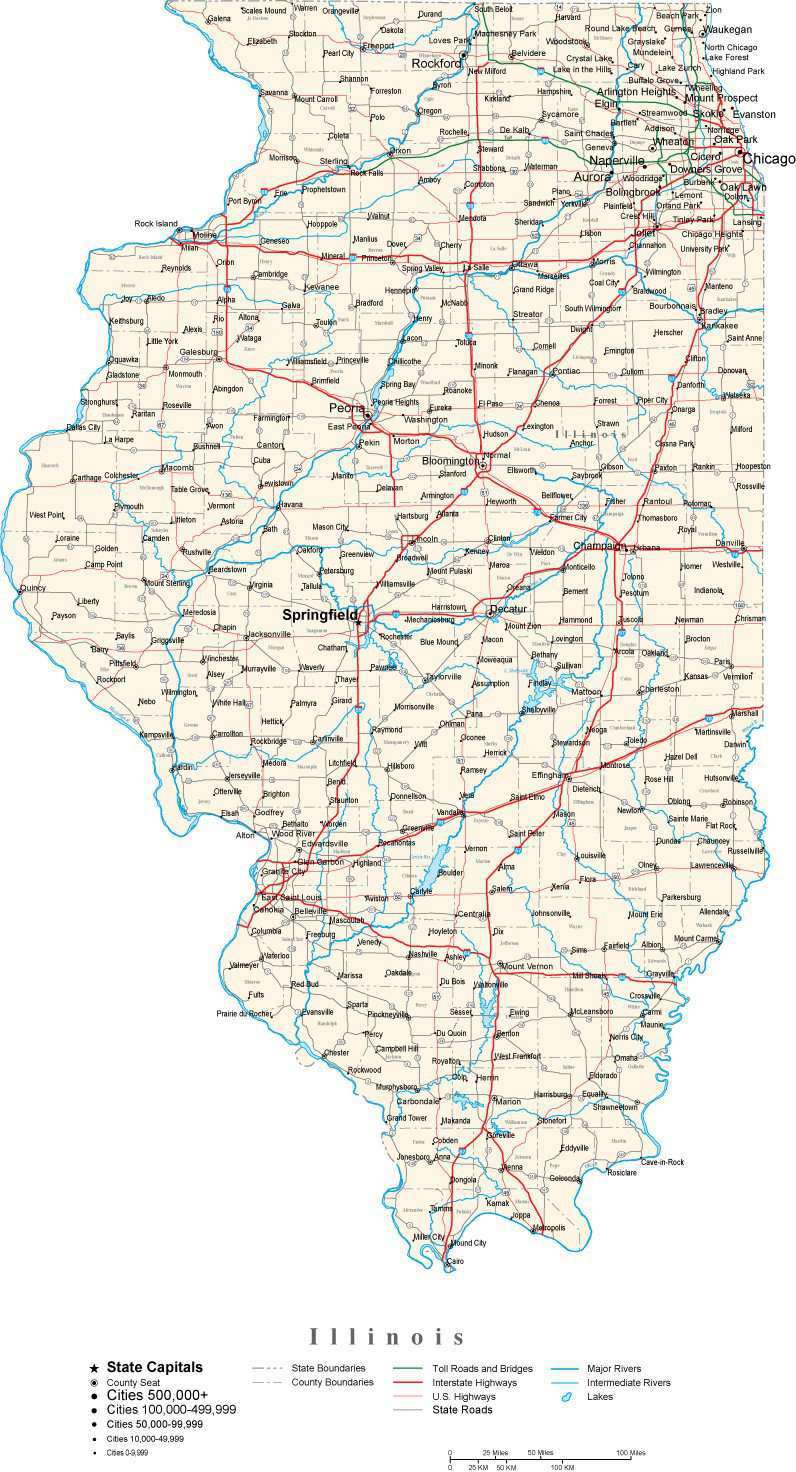 Illinois Digital Vector Map with Counties, Major Cities, Roads